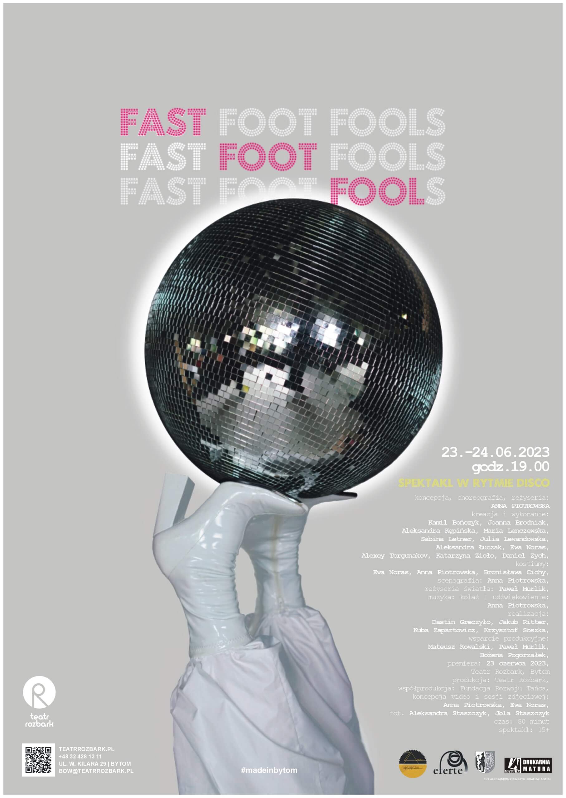 Spektakl nawiązuje do premiery Anny Piotrowskiej z 2017 r. z ówczesnym składem zespołu Teatru Rozbark, pod nazwą „Fast Food Foot”. Symboliczny powrót do pejzażu i atmosfery scenicznej tamtej pracy, jest zarazem pretekstem do pogłębienia tematu przyspieszenia w zupełnie nowy sposób. Tytułowi „szybkonodzy głupcy” („fast foot fools”) to przede wszystkim ciała zatracone w rytmie disco, błądzące po przestrzeniach popkultury, karykaturalnie zamknięte w swoich wyobrażeniach o splendorze rozrywki i w życiu, które przypomina niekończącą się dyskotekę.