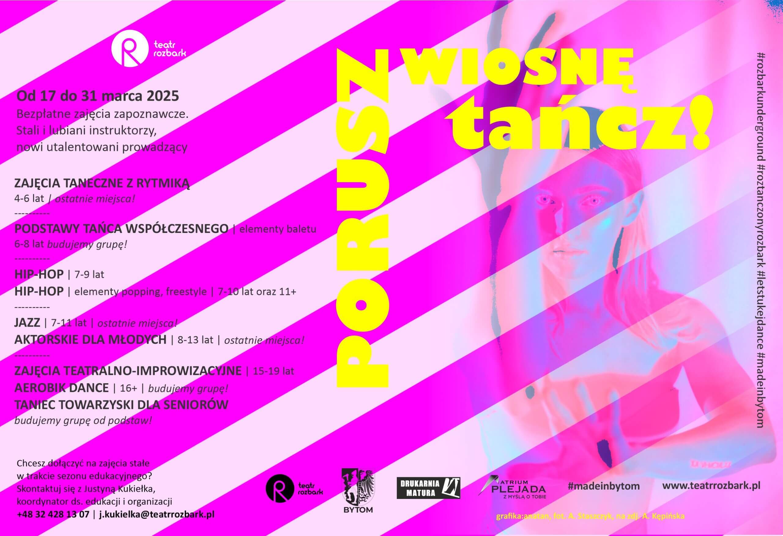 Z radością informujemy, że w dniach od 17 do 31 marca 2025 roku zapraszamy wszystkich chętnych na bezpłatne zajęcia zapoznawcze! To doskonała okazja, aby spróbować swoich sił w tańcu, a także poznać nowych ludzi oraz odkryć swoje pasje w kreatywnej atmosferze Teatru ROZBARK.