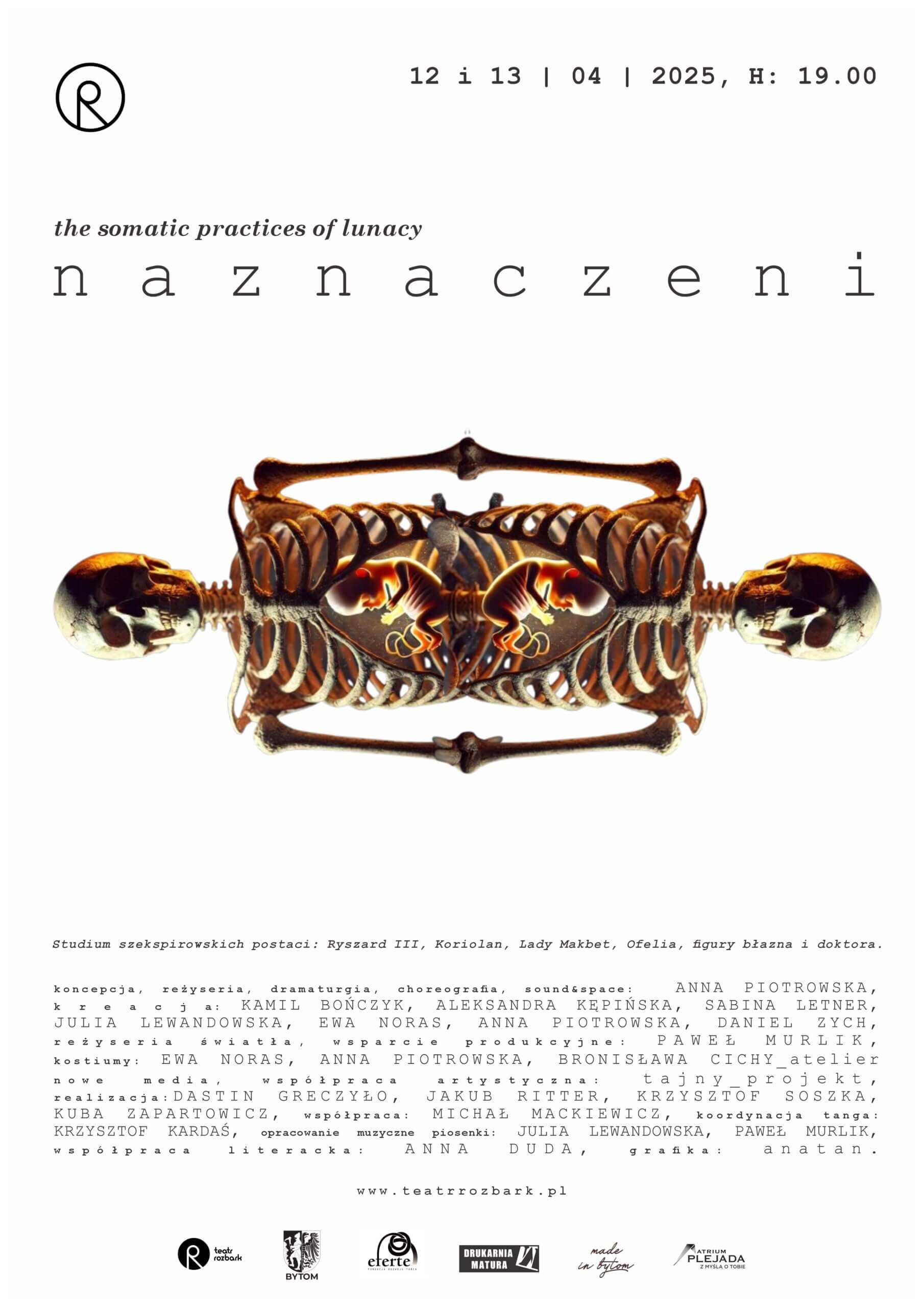 W najnowszej produkcji Teatru Rozbark, wyreżyserowanej przez Annę Piotrowską, artyści zanurzają się w świat Williama Szekspira. Czerpiąc motywy z wybranych dzieł dramatopisarza, Zespół Artystyczny eksplorował jego postaci – m.in. Lady Makbet, Koriolana, Ofelię, Ryszarda III, także figury błazna i doktora – badając ich energetyczną charakterystykę oraz symboliczny potencjał, również w kontekście współczesnej kultury. Forma spektaklu stanowi swoisty montaż – złożony z tekstów wędrujących pomiędzy postaciami – wzmacniając ich pierwotny ładunek energetyczny. Tak skonstruowana narracja kreuje oniryczny świat, w którym energie przeskakują z jednego ciała na drugie. Tworzenie sampli dla postaci i eksplorowanie ich z perspektywy somatycznego procesu lunatykowania, ujawniają charakterystyczne dla twórczości Szekspira motywy obłędu i szaleństwa. Szekspir interesował się i opisywał świat z perspektywy swoich czasów. Ukazywał mechanizmy ludzkich emocji, takich jak: chciwość, podejrzliwość, chęć dążenia do dominacji i panowania nad innymi. Te psycho-fizyczne przeskoki między jedną historią a drugą stanowią metaforę wpływu, jaki wywieramy na siebie nieustannie.